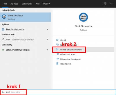Pokud hru spouštíte přes zástupce na ploše, je možné, že má zástupce špatný odkaz na hlavní soubor hry SimtSimulator.exe. Smažte zástupce na ploše a ve Windows vyhledávání napište „Simt“ (viz obrázek) a klikněte na „Otevřít umístění souboru“.